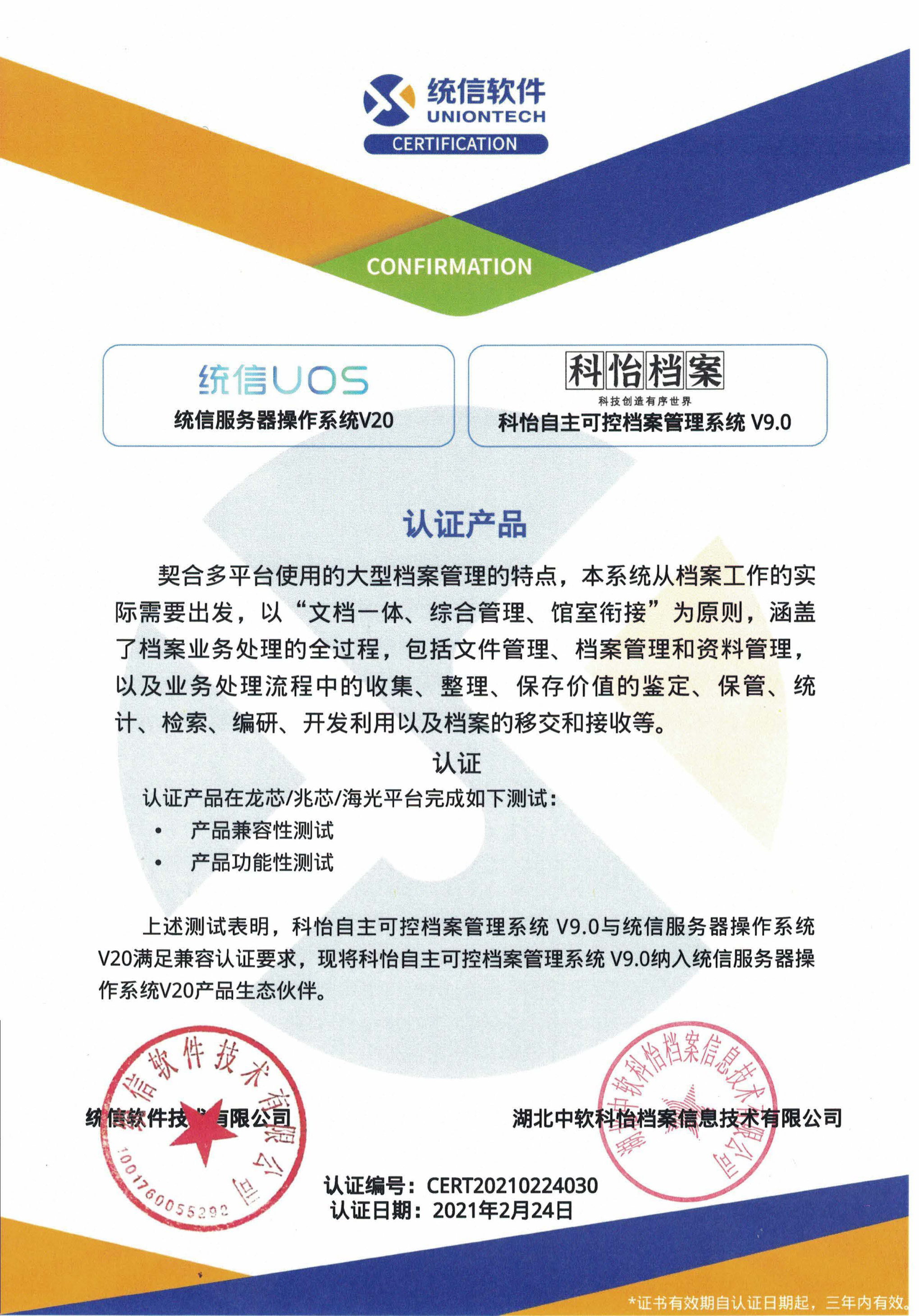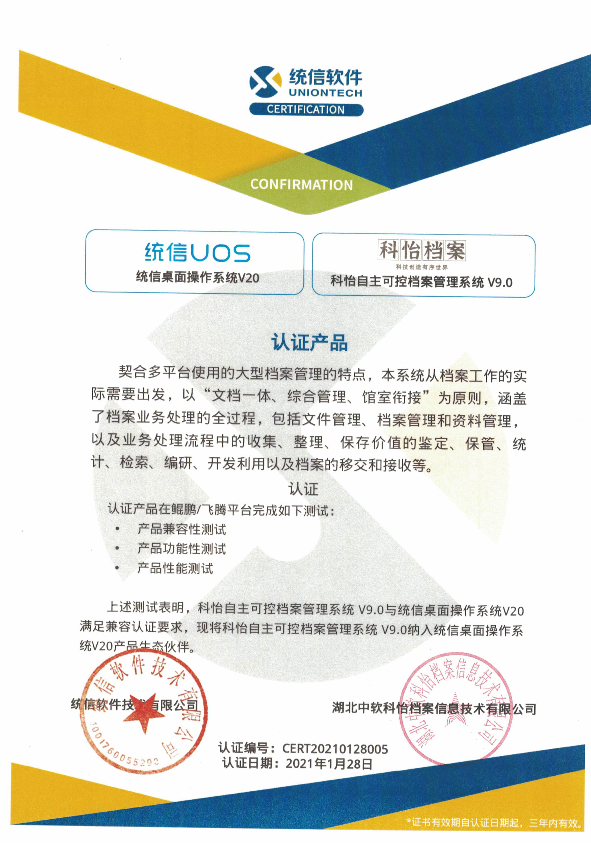 北京统信软件技术有限公司和湖北中软科怡档案信息技术有限公司对桌面/服务器操作系统和科怡自主可控档案管理系统V9.0的兼容适配性进行联合认证测试,得出以下结论: